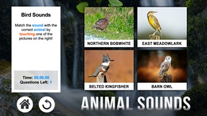 CD Meyer has developed this interactive, educational, computer game to test your "ear." Players will be presented with a screen of images and will hear a sound. Simply match the sound with the correct animal. This version of the game displays several screens of birds along with their sounds. As in most of our games, this game is fully customizable. The game can be changed so that players match the sounds of different types of animals, or anything that makes a sound. Each time a screen is displayed, it randomly places the images and randomly chooses a sound.